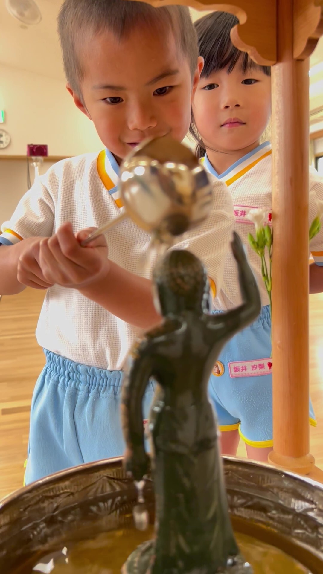 5月12日は花まつりの行事がありました。園長先生のお話や、あつし先生の法話、先生たちによるおしゃか様の紙芝居をみて、最後に甘茶かけを行いました。