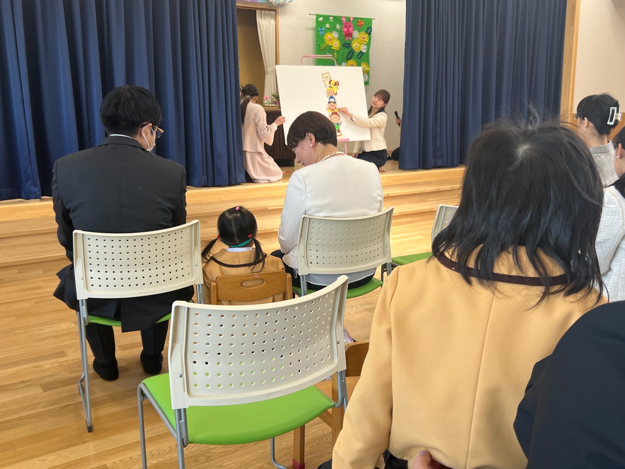 今年の入園式では、担任の先生たちの自己紹介後に、手遊びやペープサート「おおきなかぶ」の物語を披露いたしました。子ども達も楽しく見入っていたようです!
