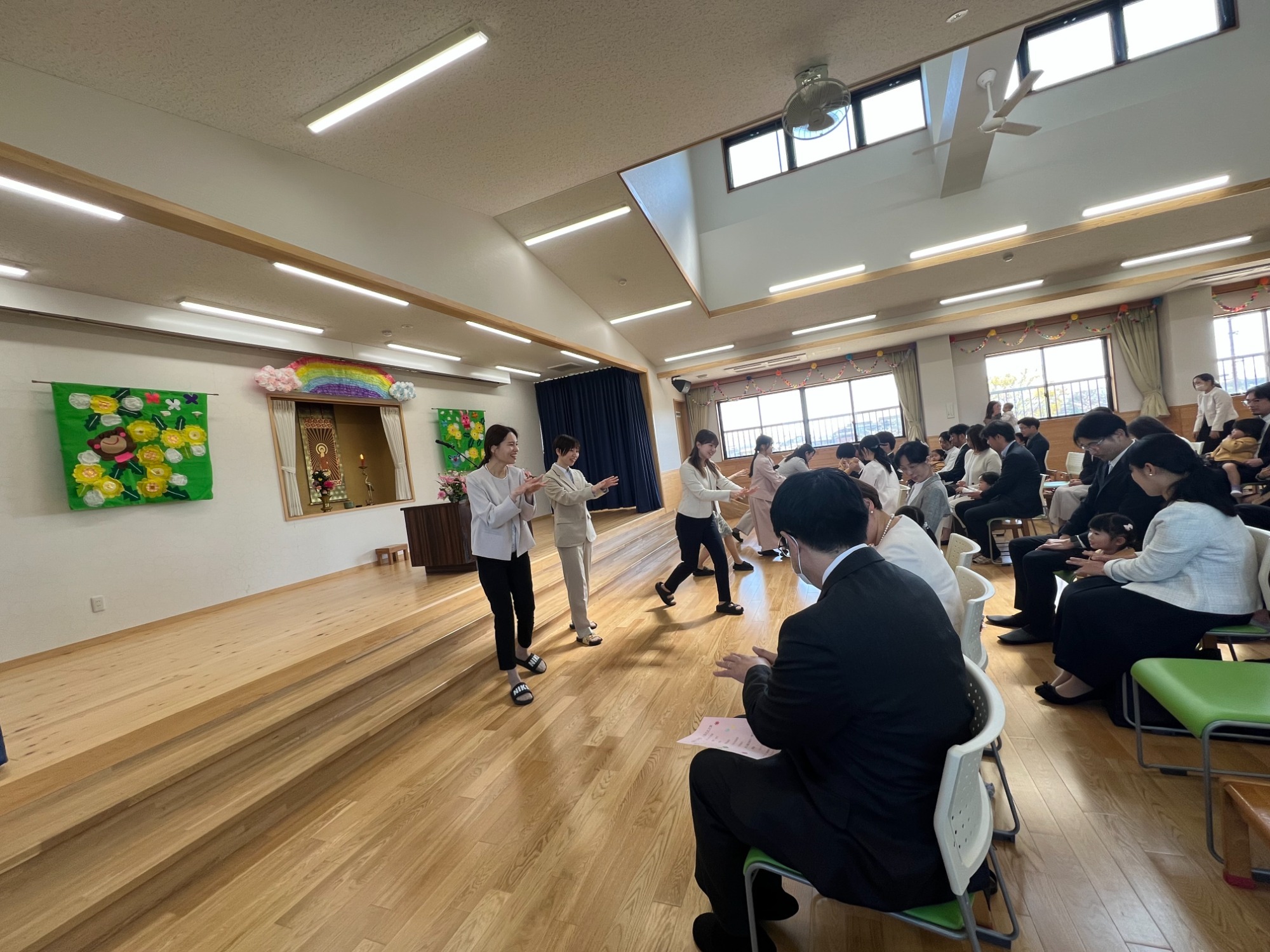 園児はお遊戯室に集まり、園長先生のお話、惇先生の法話、お釈迦様誕生の紙芝居を聞きました。そして花御堂に甘茶かけを行い、皆で甘茶を飲みました。