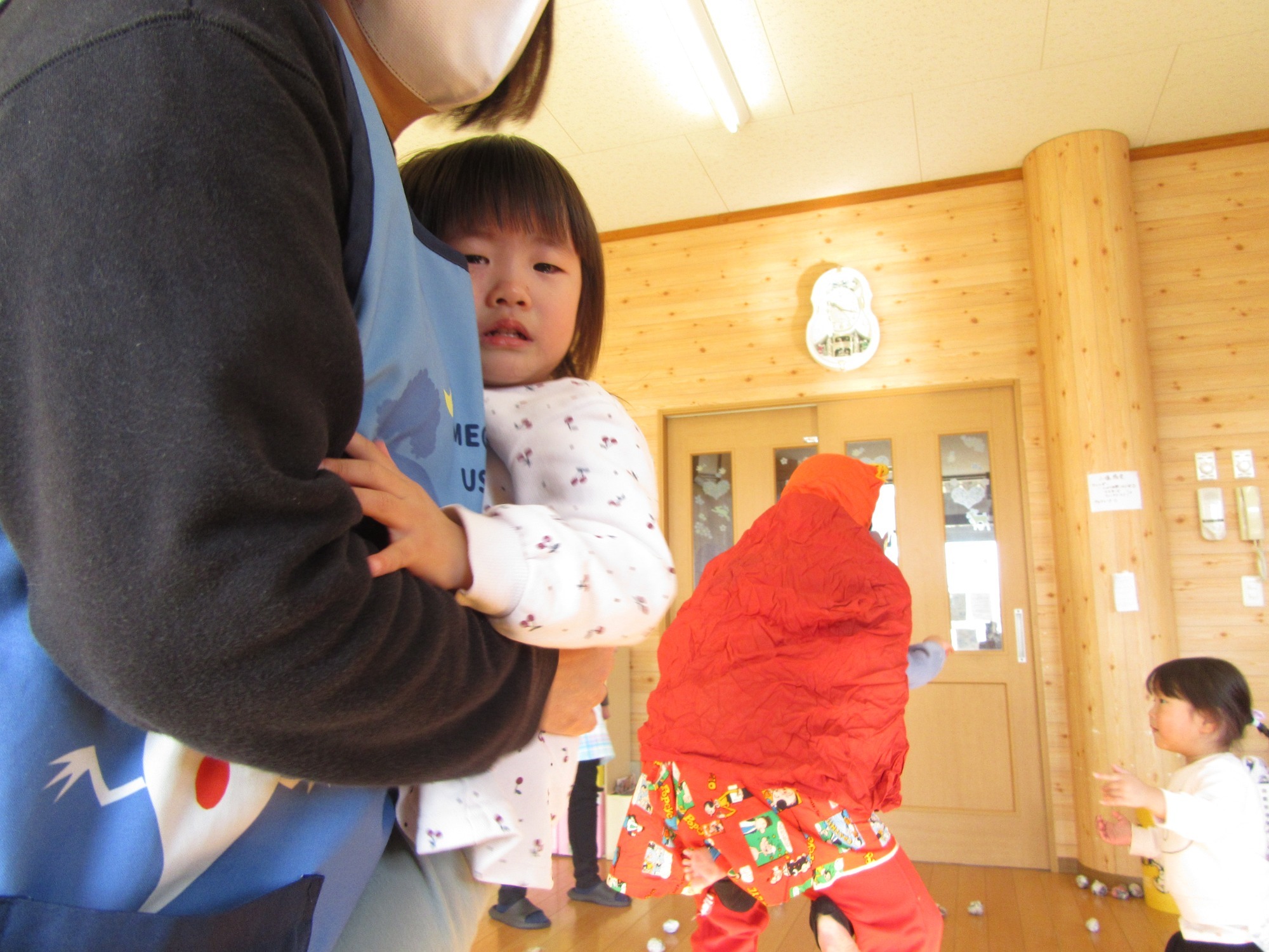 恐怖で大泣きしている子もいれば、後ずさりながらも勇敢に豆を投げる子もおり、日常から離れた行事を行う事ができたことで、心身ともに元気なすみれっこへ育つことを願います。