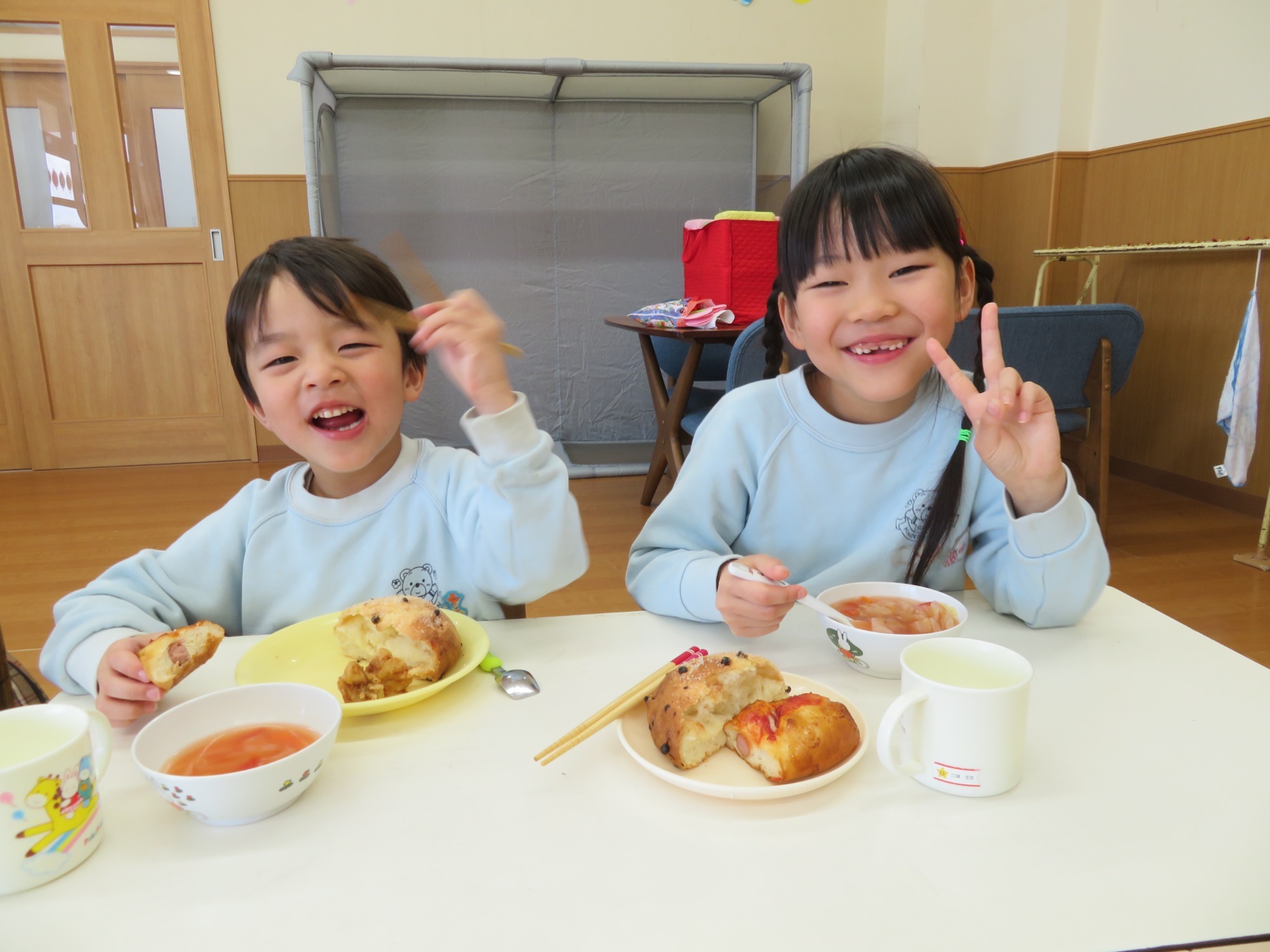 茶話会は、縦割り保育にしていろんな年齢の子ども達と一緒に、お遊戯室で〇×ゲームをしたり、からあげや二種類のパンなど豪華なメニューの給食を食べながらお話したり、特別な一日となったようです。