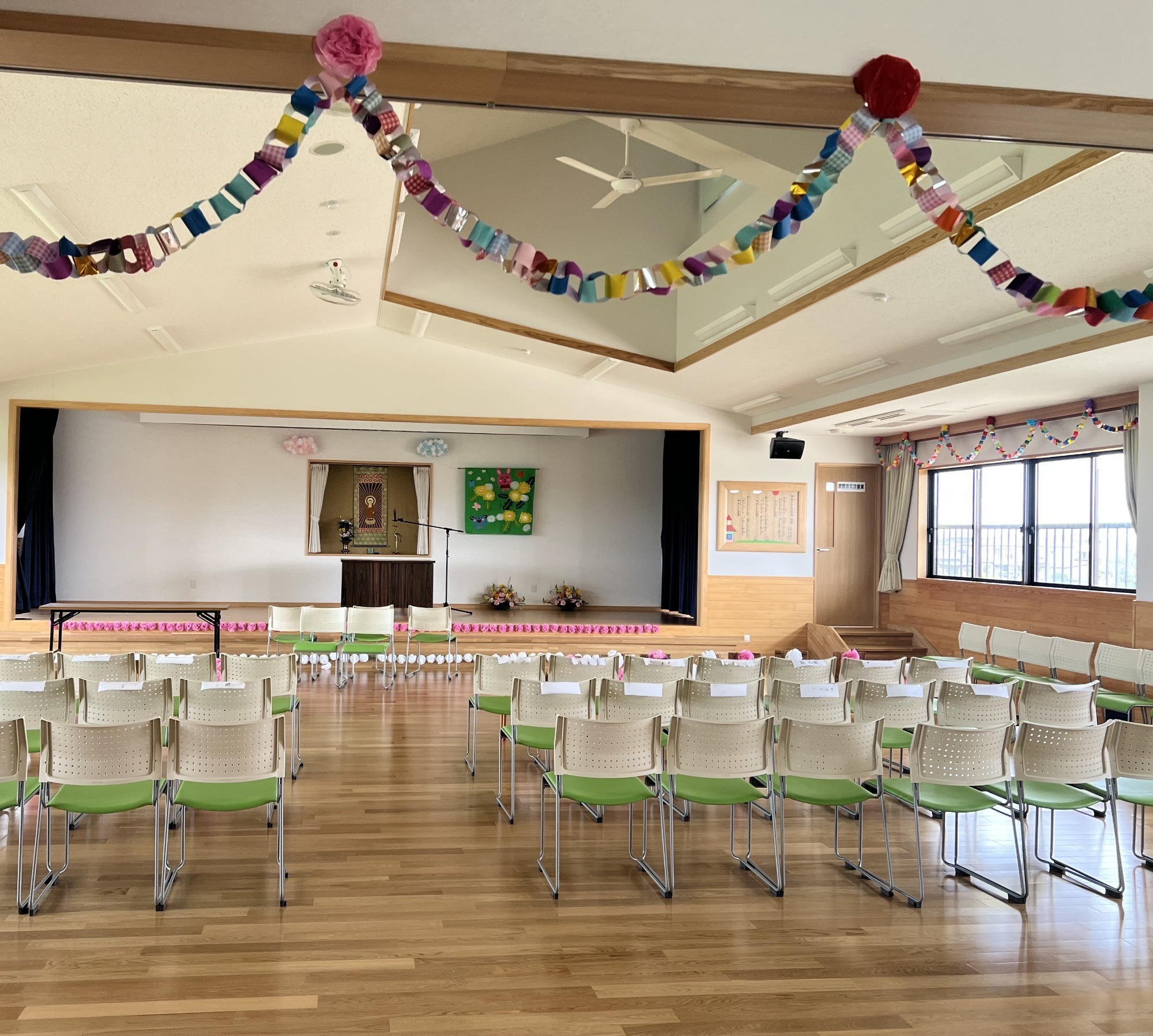 7月7日は七夕祭りを行いました。全園児はお遊戯室に集まり、朝の歌と七夕の歌を歌い、園長先生のお話を聞き、職員による織姫と彦星の物語のブラックシアターを楽しみました。また笹飾りの制作物や願い事を書いた短冊を笹に飾り、七夕の行事を行いました。